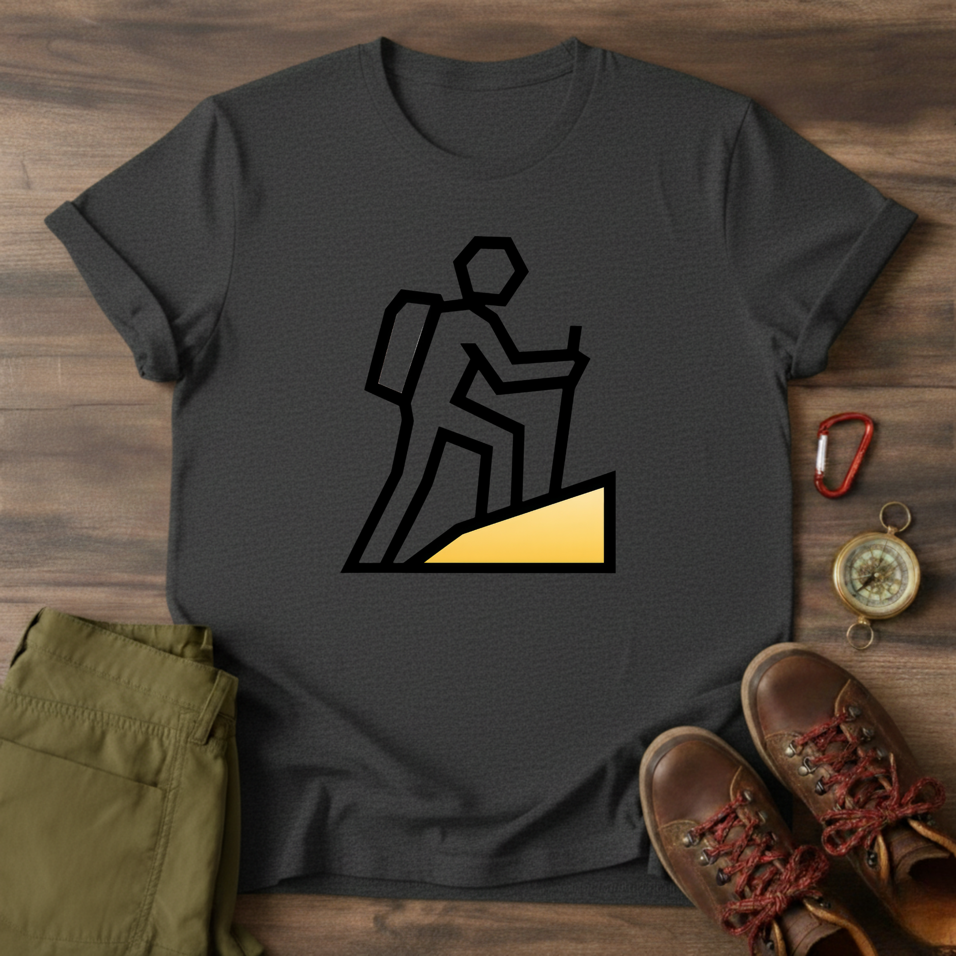 This lightweight cotton tee carries a clean, outdoorsy badge — a simplified hiker icon ascending a golden slope. It reads like a small declaration: slow miles, early mornings, and weekends spent chasing ridgelines. Wear it layered under a flannel for cool mornings or alone when the trail heats up. The classic crew and relaxed fit keep movement easy while the soft ring-spun cotton feels breathable on long walks or around town. Subtle, bold and wearable — it signals a love for the trail without shouting.
